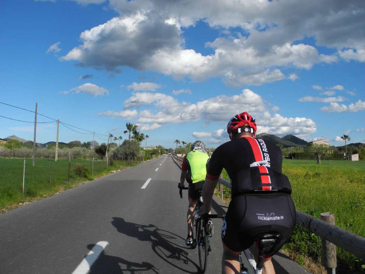 Glück ist, wenn man trotz „Germania“-Pleite mit 14 Mitreisenden am selben Tag ins Hotel gelangt wo ein reichhaltiges Büffet auf einen wartet. Die Räder erst am nächsten Tag in Empfang zu nehmen, ist ein Geschenk. Es reichte auch zu einer ersten gemeinsamen Ausfahrt auf den Randa über 113 km vorbei an Sineu, Aigaida und zurück über Montuiri mit Kaffeepause in Sant Joan. Bei Santa Margalida trafen wir am Morgen, in 2 Gruppen gestartet, auf Bene und seine Gruppe. Er hat uns den schönen Weg über Sa Pobla durch die Gemüsefelder zeigte.